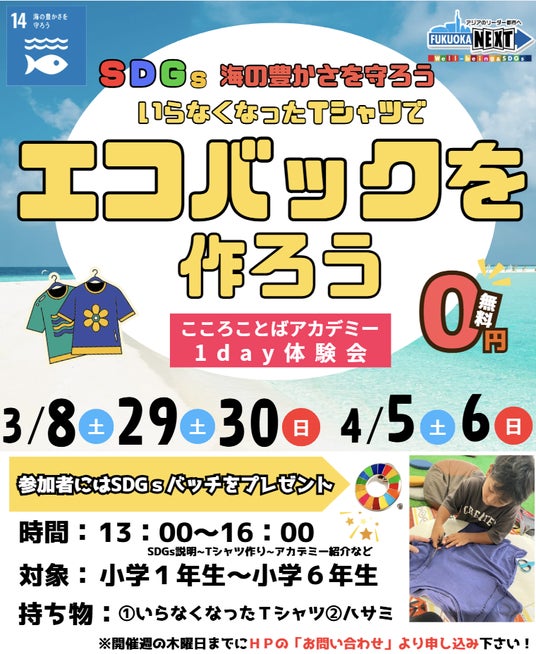 株式会社こころことばアカデミー(本社・福岡市、代表取締役・稲員諒翔)は、同社が提供するプログラム「やってみ!」を1日で体験できる1Day体験会を開催します。SDGs14番「海の豊かさを守ろう」をテーマに、いらなくなったTシャツを持ち寄り、自分だけのオリジナルエコバックを作る体験を通して、子どものグローバルリーダーシップや非認知能力を高めます!