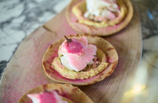 そば粉生地のタコスに枝豆フムスを重ね、桜鯛コンフィを忍ばせたフィンガーフード。桜ソースと塩漬けした桜の花びらが春気分を高めてくれる一皿です。
