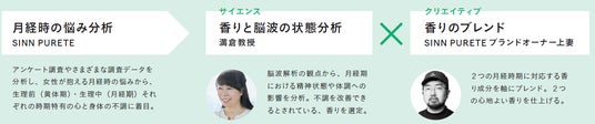 香りが脳に与える効果について慶應義塾大学満倉教授と共同研究を実施。女性特有の体や心のゆらぎに寄り添う香りを脳波解析に基づいて分析し、悩みに合わせた2つの香りを導き出しました。