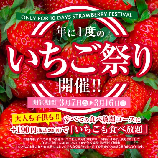 ◆内容:すべての食べ放題コースに大人も子供もおひとり様につき追加料金190円(税込209円)で「いちご」もKAMIMURA BARにて食べ放題(幼児以下無料) ※ご注文はグループ全員同一でお願いいたします。 ※単品販売はいたしません。