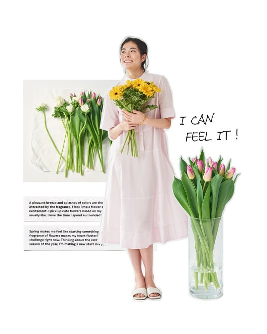 香りに惹かれて、花屋をのぞくと、心が弾む。好きな花というよりは、”かわいい“と思う直感で集めてみる。大好きな花たちに囲まれる時間は、愛おしいもの。春は、何か新しいことをはじめたくなる。花の香りで満たされた部屋で、胸を躍らせる!今なら何にでも挑戦できそう。最高のシーズンに着たい洋服も考えて、前向きな気分で新しいスタートを。