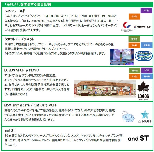 日用品のお買い物はもちろんのこと、西三河エリア屈指の高感度なファッションブランドが充実しているため、都市部まで足を運ばずとも最新のトレンドを安城の地で楽しむことができます。さらに、新業態のエンターテインメント施設も充実しており、映画やアクティビティを通じて、ご家族やご友人との豊かな時間を提供します。地域の皆さまにとって、日常と非日常をつなぐ新たな拠点となることを目指しています。