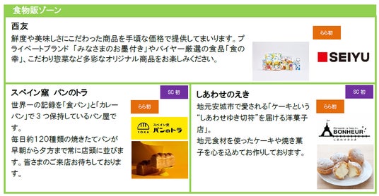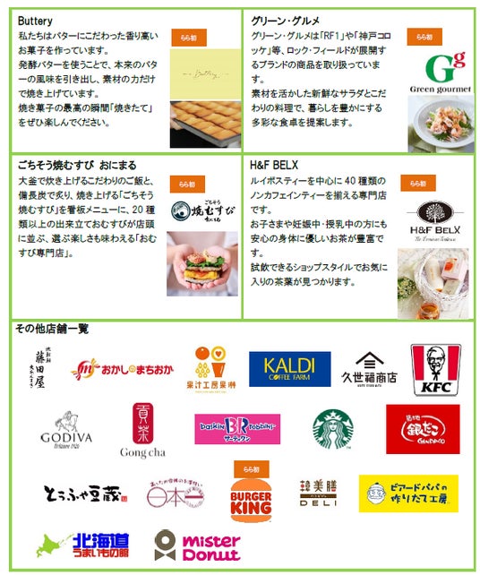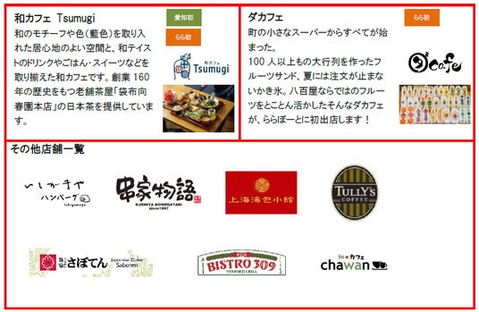 館内の飲食・食物販店舗では、お子さま連れのご家族を歓迎するため30店舗以上でキッズメニューを提供します。愛知県初出店18店舗、ららぽーと初出店25店舗を含め、テイクアウトに対応したファストフードからゆっくりとお食事をお楽しみいただける飲食店まで、お客さまの多様なニーズにお応えできる充実したラインナップでお客さまをお待ちしております。