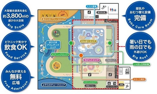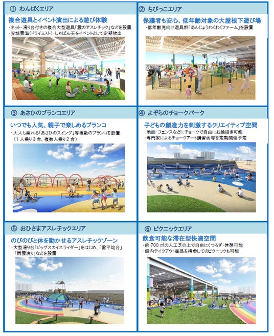 屋上には、全体面積約3,800平方メートル 、46台の遊具、60種類以上の遊びを備えた遊具数日本一のルーフトップパークが誕生します。広場は6つのエリアにわかれており、自由に行き来しながらエリアごとに異なる遊びを無料で体験・体感することができます。広場のうち約2,100平方メートル は大屋根に覆われ、雨の日でも存分に遊びを楽しめます。幅広い年齢層に対応可能なバラエティ豊かな遊具群、ピクニック気分で飲食可能な人工芝、保護者もくつろげる屋内待合室、乳児対応が可能な専用ベビーケアルームなど、「子どもの遊び」と「保護者の育児・子育て」の両立を目指した空間です。