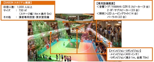 本施設中心部の大規模な吹抜空間において、面積730平方メートル 、収容人数1,000人以上のスタジアムコート「SAISONスタジアム」を設置しています。1Fから4Fまでの大規模な吹抜空間に400インチ大型メインビジョンと2階壁面を360度取り囲むリボンビジョンを配置。最新の音響・照明システムと組み合わせることで、プロスポーツの試合さながらの臨場感あふれる演出を実現します。