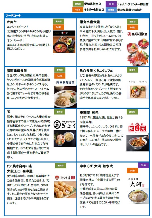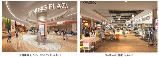 - 愛知県初出店31店舗を含む全215店舗を一挙公開。県内最大となる1,250席のフードコートとレストランが融合した、大規模飲食ゾーンが誕生。