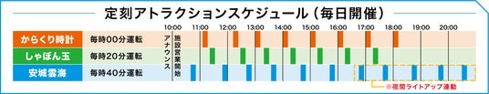 ルーフトップパークでは、来場者をお出迎えする複数の定時アトラクションをご用意しています。具体的には、「からくり時計」の音楽と動作による定時通知、しゃぼん玉発生器による「しゃぼんシャワー」に加え、複数ドライミストの同時噴出による「安城雲海」を毎日実施いたします。特に「安城雲海」は2時間ごとにミスト規模の大きい「大雲海」を実演します。また、夜間はライトアップと連動した幻想的なシーンをお届けします。