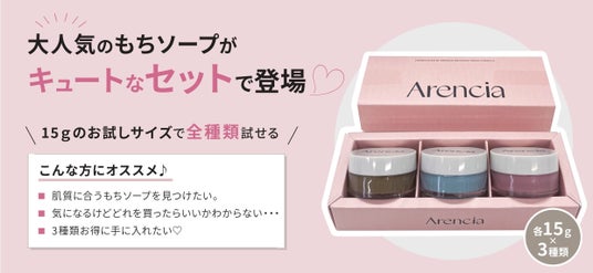 日韓のSNSで話題の韓国発のスキンケアブランド『Arencia(アレンシア)』から、韓国で売り切れ続出のもちソープが可愛いミニセットになって登場。独特なもちもちとしたテクスチャーが特徴的なもちソープを3種類、お試しいただける日本限定セットになっています。