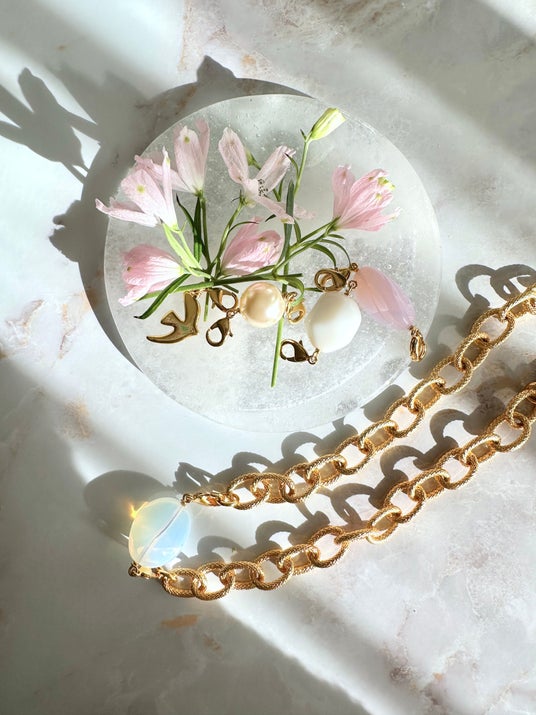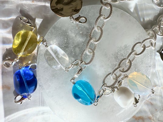 涼やかでスタイリッシュなシルバーカラーのネックレスチェーンに合わせて、チャームを変えて楽しめるガラスストーンやメタルのパーツも色とりどりにご用意し、ますますバリエーションが広がりました。メッシュチェーンのイヤリングやピアスとともにお楽しみください。