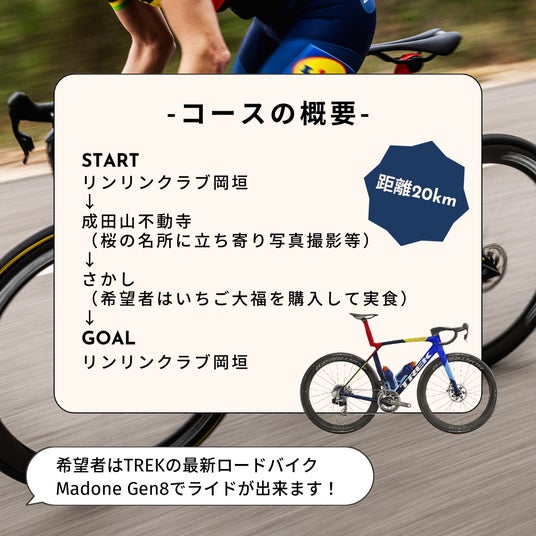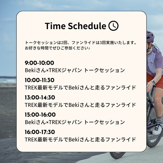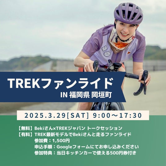 TREKの最新モデルで岡垣町の風景を楽しみながら、サイクリングの新たな魅力を発見できるイベントを開催。ゲストのBekiさんと語り、走ることで、自転車が生み出す楽しさや地域とのつながりを感じる特別な時間を提供します。また、会場にはキッチンカーも登場し、休憩しながら飲食を楽しむことも可能。初心者から経験者まで、それぞれのスタイルで満喫できる1日をお届けします。