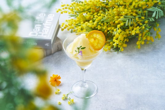 ロビーラウンジ&バー【ハナリ】では『ミモザソルベ』(※1)を提供いたします。沖縄県産シークワーサー果汁を贅沢に使用し、ミルクを加えてまろやかな味になるよう仕上げたソルベです。提供時にお客様の目の前でスパークリングワインを注ぐことで、泡立ちとともに爽やかな香りが立ち上ります。またこちらはノンアルコールスパークリングワインでも提供可能な一品です。時間経過とともに溶け出したソルベとスパークリングワインの絶妙な味わいをお楽しみいただけます。
