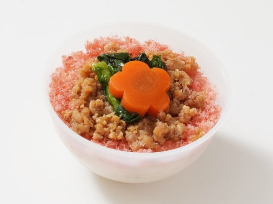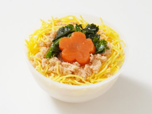 かつお節だしで炊き込んだご飯の上に、桜でんぶや九州産の華味鳥を使用した鶏そぼろ、だしを利かせた花にんじんと菜の花をのせ、華やかに仕上げました。
