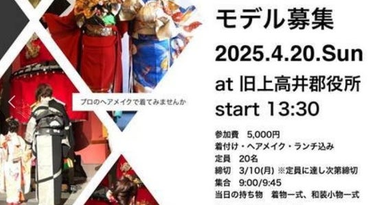 モデル参加費 着付けヘアアレンジ、お昼込み 1名5000円