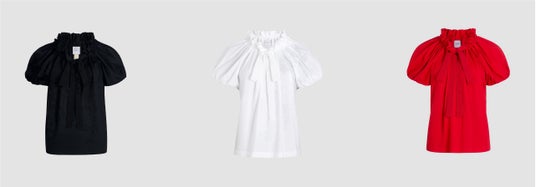 リサイクルポリエステルを使用したブラウス。首元のグログランリボンは、結んだり肩を出したりとお好みのシルエットで着用できます。