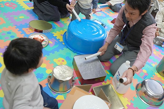 素材の違いによって大きな音や小さな音、高い音や低い音など、様々な音を聴き比べたり、西が叩くリズムに合わせてみんなで楽しく合奏しました。
