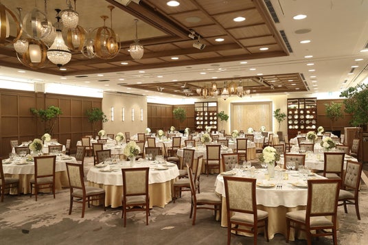 会場はニューヨークスタイルの重厚感とゲストハウスの華やかさを併せ持つバンケットルーム。※会場の設営はイメージです。着席ですが丸テーブルではありません。