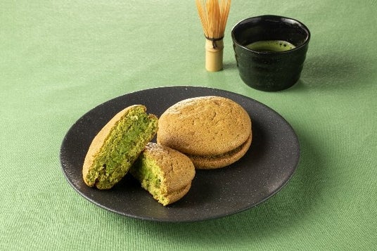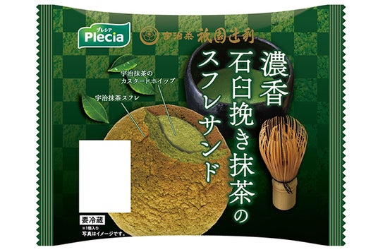 【商品特長】 抹茶香るスフレで、ほろ苦い抹茶のカスタードクリームをサンドしました。口に入れた瞬間、抹茶本来の香り
