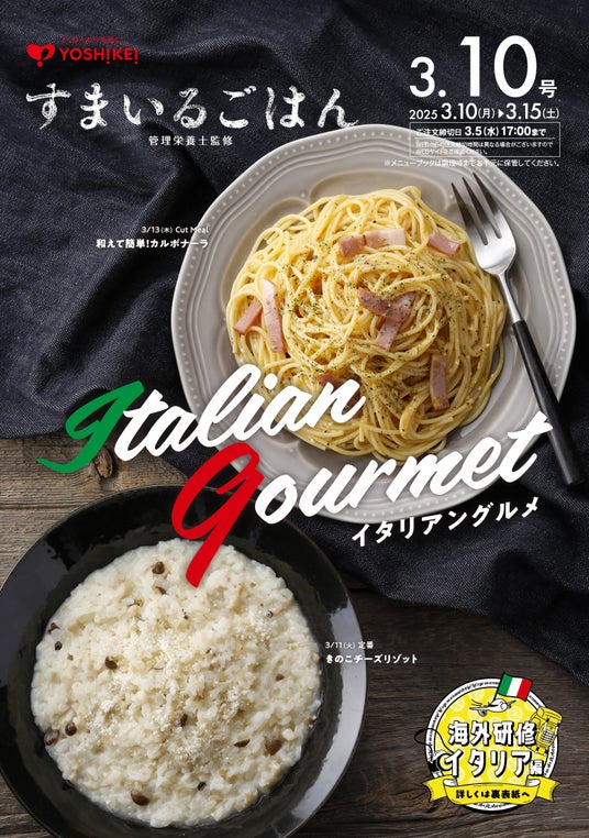 つくる人から笑顔に。をテーマに全国でミールキット宅配サービスを提供するヨシケイグループ(本部所在地:静岡県静岡市/代表取締役: 平野 圭吾)は、「すまいるごはん(3月10日号)」「Lovyu(3月17日号)」で社員による海外研修をもとに開発した「イタリアングルメ」を発売します。