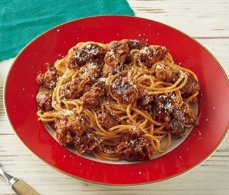 ボロネーゼとは挽き肉、野菜、赤ワインなどを煮込んだイタリアのボローニャ地方発祥の伝統的なソースです。今回は赤ワインをベースにコクをだしたデミグラスソースと合わせたハンバーグを使用して、本格的な味に仕上げました!ゴロッとした食感を楽しめます♪