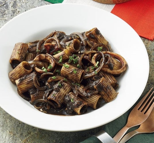 イカスミ料理が手軽にできる、使い切りで便利な無添加の「いか墨」を使用したパスタ!クセがなく食べやすいので、挑戦しやすい味です。今回は太めの筒状で表面に筋状の模様が入ったショートパスタ「リガトーニ」を使用しました。みんなで歯を黒くしながら食べるのも楽しい♪