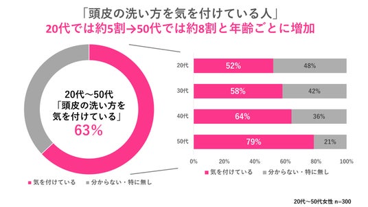 続いて、「頭皮の洗い方」について全国の20代~50代女性300人に調査したところ、「頭皮の洗い方に気を付けている」という回答者は全体で63%となりました。20代では約5割に留まりますが、年齢を重ねるごとに増加し、50代が約8割(78.6%)と最多という結果に。