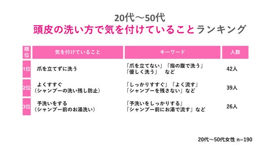 また、190名に対し、「頭皮の洗い方で気を付けていること」をフリーアンサーで調査しました。キーワードごとに、ランキング形式にまとめた結果は以下の通りです。