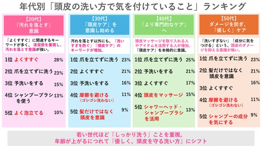 20代は「汚れをしっかり落とす」ことを重視し、年齢を重ねるにつれ「優しく、頭皮を守る」意識にシフト。