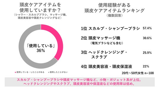 全国の20代~50代女性300人に調査した結果、「頭皮ケアアイテムを使用している」と回答した人は36%(108人)という結果に。使用アイテムの第1位はスカルプ・シャンプーブラシ(57.4%)、次いで第2位は頭皮マッサージ機(30.6%)となりました。