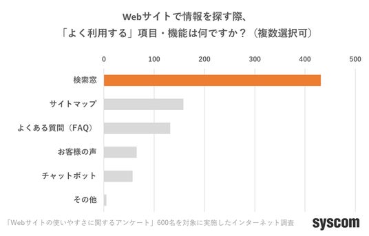Webサイトで情報を探す際、「よく利用する」項目・機能を聞いたところ、1位「検索窓」、2位「サイトマップ」、3位「よくある質問(FAQ)」という結果となりました。