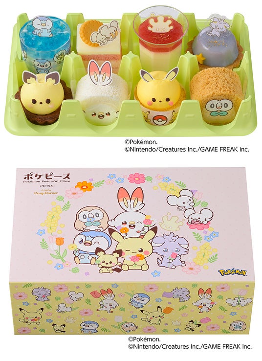 特長:ポケモンたちが勢ぞろいしたかわいらしいデザインのボックスに、バター、もも、抹茶の風味豊かに焼き上げた「マドレーヌ」3種と、ヒバニー&ニャスパーなどのデザインをプリントした「クッキー」4種をアソート。