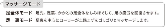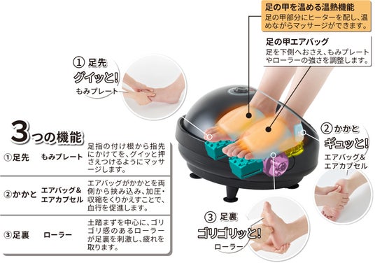 エアバッグ・エアカプセル・もみプレート・ローラーの組み合わせで一日の足の疲れをやわらげ、血行を促進します。足の甲部分にはヒーターを内蔵し、じんわり温めながらマッサージすることもできます。足の対応範囲は22cm~28cmです。
