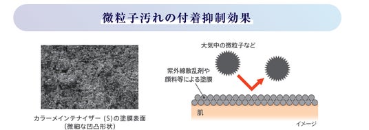 紫外線散乱剤や顔料等の配合により塗膜表面に繊細な凹凸が形成され、「付着抑制効果」が発現。大気中の微粒子汚れ*1付着を防ぎます。