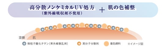 高分子分散剤が微粒子酸化チタン凝集を防ぎ、粉っぽくなったり白浮きせず、なめらかな感触で、透明感のある美しい肌へと色補整します。