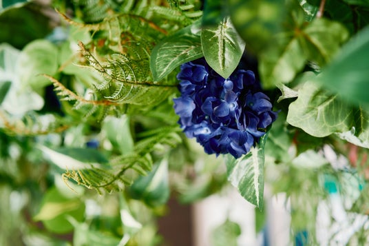天井部分には、スパニッシュモス、コウモリラン、ツタ類をふんだんに使用し、アクセントとして『Sukumo~蒅~』のテーマカラーである藍色の紫陽花を配置。