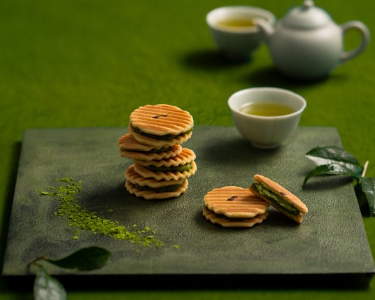 「姫千寿せんべい 有機抹茶」に使用されている抹茶は、京都府和束町の有機栽培で作り上げた茶葉を使用しています。抹茶の濃厚クリームは、抹茶本来の深みのある繊細な風味を活かすため、甘みとのバランスを何度も調整し、なめらかな味わいに仕上げました。抹茶の渋みやまろやかな甘みと千寿せんべいの味を堪能できる商品です。