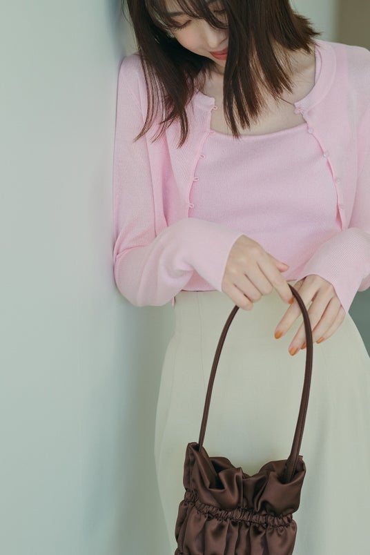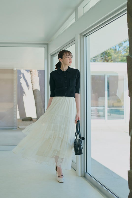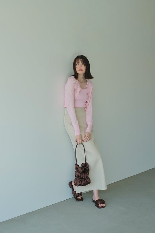 CARDIGAN ¥8,250/ INNER ¥4,950/ SKIRT ¥10,450/ BAG ¥9,900/ SHOES ¥12,100