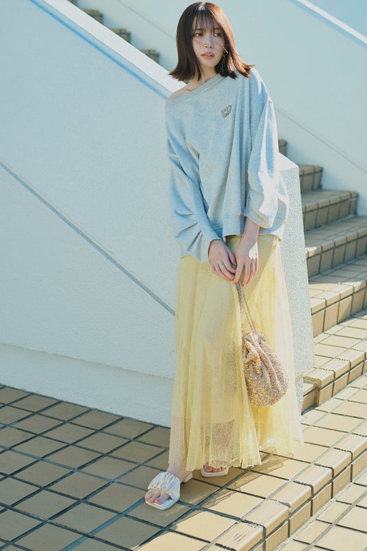 SWEATSHIRT ¥9,350/ SKIRT ¥13,200/ BAG ¥7,700/ SHOES¥12,100