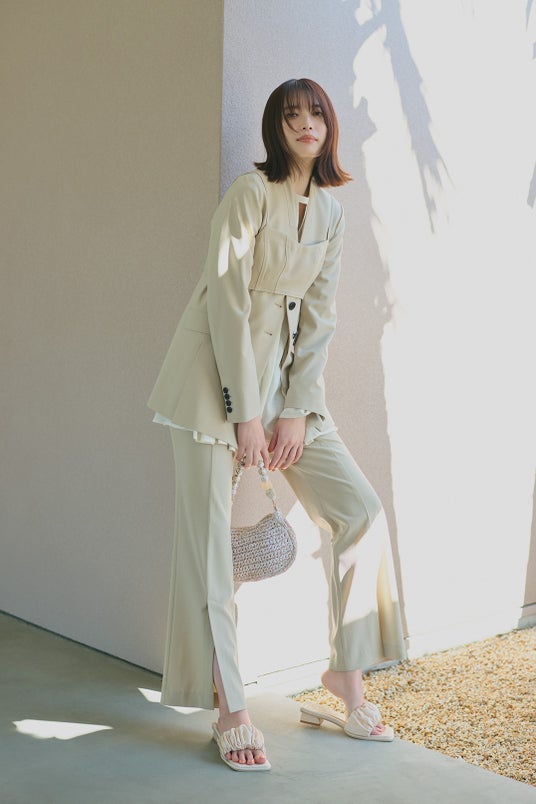 JACKET ¥17,600/ BUSTIER × BLOUSE SET ¥14,850/ PANTS ¥12,100/ BAG ¥8,800/ SHOES ¥12,100