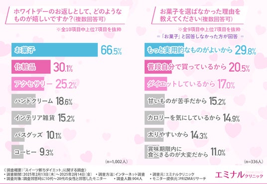 ホワイトデーのお返しでは「お菓子」が最も人気でしたが、実用的なアイテムを求める人や、ダイエット中で甘いものを控えたいと考える人も一定数いることが分かりました。