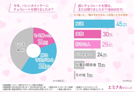 はじめに、バレンタインデー前日と当日に調査を行い、「今年、バレンタインデーにチョコレートを贈りましたか?」と質問したところ、約6割の方が『もう贈った(19.3%)』『贈る予定がある(39.7%)』と回答しました。