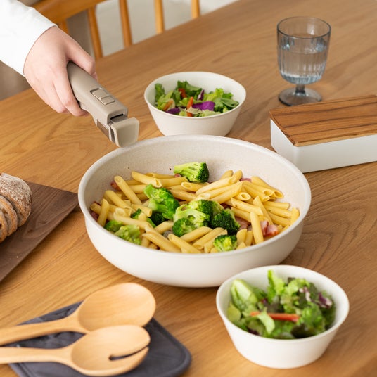このセットは、忙しい日常をサポートできるように調理の効率を高めるだけでなく、片付けの手間も軽減します。取っ手をとれば、まるで食器のように食卓に出すことができ、洗いものも減ります。