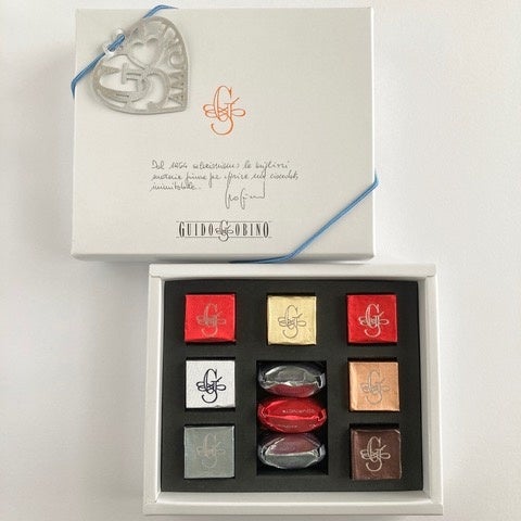 チョコレート激戦区イタリア・トリノにて人気を誇る<グイド ゴビーノ>からは、トリノ本店の人気商品を厳選した10粒入りアソートセット。下層にビタージャンドゥーヤ、上層にホワイトチョコレートの中にキャラメッラートされたヘーゼルナッツをちりばめた大人のチョコレート「ドッピョストラート」は日本限定のフレーバーです。