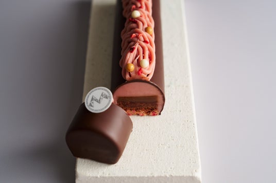プチガトー、グランガトー、地方菓子、焼菓子、パン、ショコラなどが豊富に揃う、パティシエ 辻口博啓氏が手掛けるパティスリー<モンサンクレール>。しっとり濃厚なブラウニーに、甘酸っぱく口溶けの良い苺のガナッシュを合わせ、ショコラでコーティング。ほろ苦いキャラメルがアクセントになっているリッチなケークショコラです。