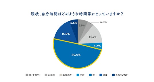 平日に自分時間をとる時間帯については、夜と回答した人が49.4%と最も高く、続く深夜の15.9%と比べて30ポイント以上の差となりました。