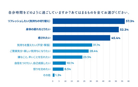 また、自分時間を過ごす目的については、リフレッシュしたい(57.3%)、身体の疲れをとりたい(52.3%)、癒されたい(45.4%)と続く結果になりました。