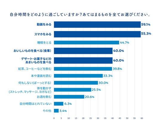 自分時間の過ごし方については、「スマホをみる(59.1%)」や、「動画をみる(55.3%)」などの日常的なデジタル習慣を自分時間としている人が多い結果となりました。