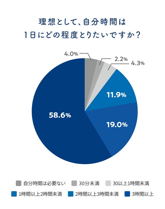 また、平日の自分時間について、理想の時間を聞いたところ、3時間以上と回答した人が58.6%と過半数であったのに対して、実際の取得状況については、平均して1時間未満の人が26.6%と、約4人に1人が短時間のリラックスタイムとなっていることが判明しました。さらに、3時間以上とれている人も35.1%と、理想よりも20ポイント以上低い結果となりました。