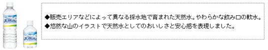 今回、パッケージは、悠然な山のイラストで天然水としてのおいしさと安心感を表現するとともに、白色と水色を基調としたカラーにより、爽やかさを感じることができるデザインとしました。