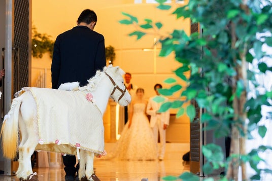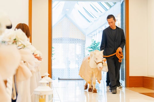 人懐っこいポニーが挙式をお手伝い。ふたりのマリッジリングを祭壇 まで大切に運んでくれます。新生活に安定をもたらすといわれる幸運のポニーと一緒に、いつまでも記憶に残る特別な時間を。