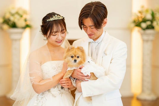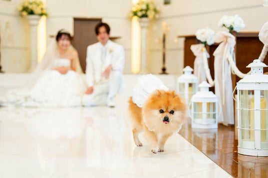 おめかししてリングドッグに挑戦してみたり、結婚証明書に肉球を押したり。前撮りにも同伴OKだから、一緒の写真もたくさん残せる!